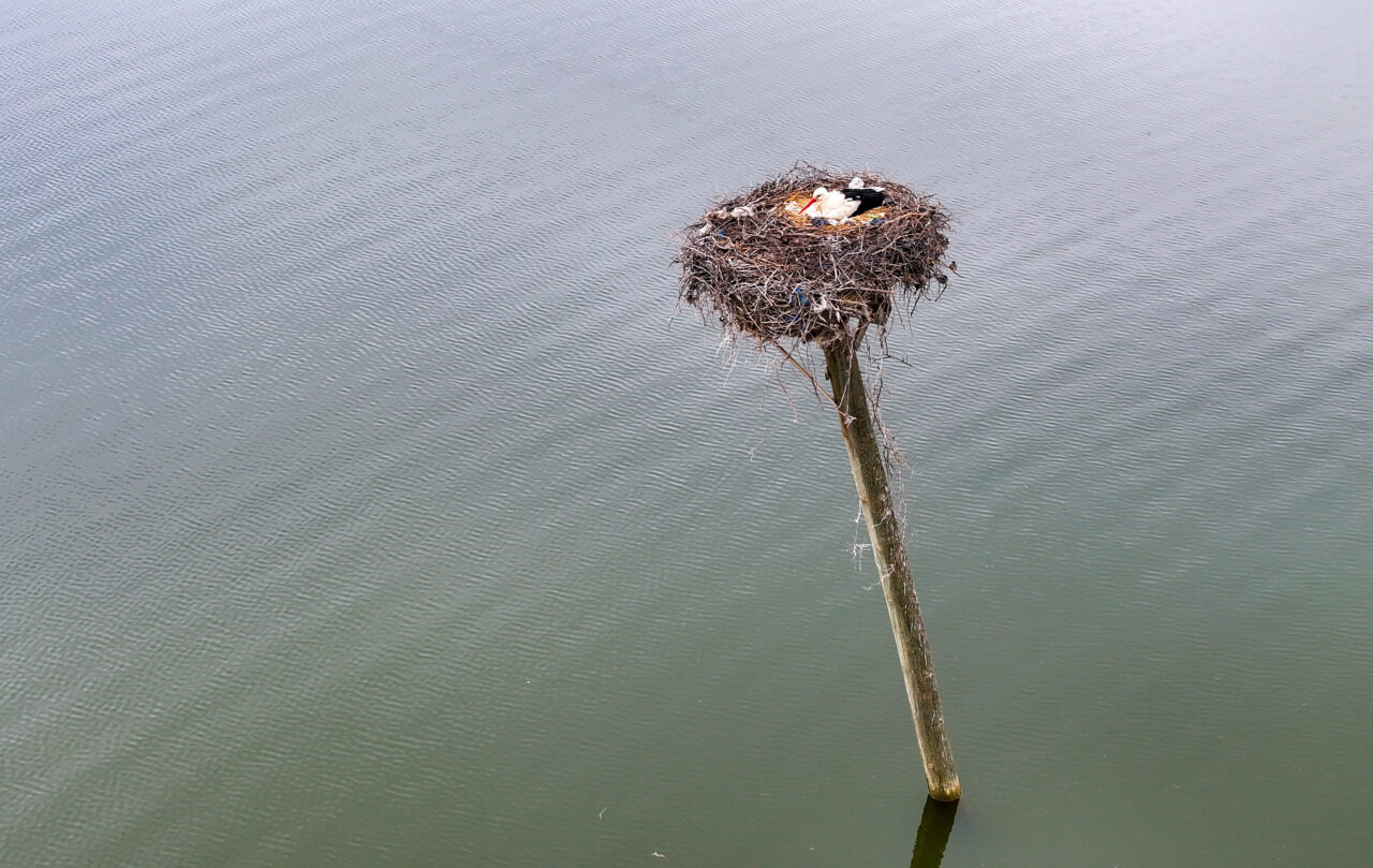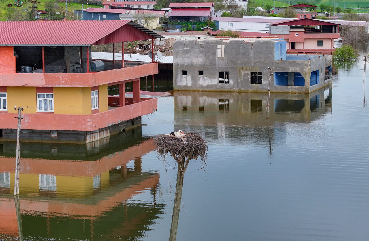 Dronla kaydedilen görüntülerde, su altında kalan okul, cami, birçok ev ile leylek yuvasının bulunduğu direk yer alıyor.