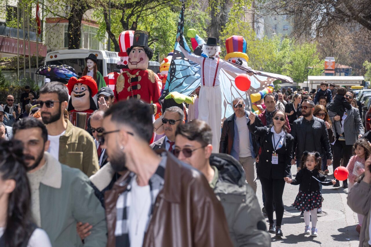 Tanrıverdi'nin çocukları ve vatandaşları selamladığı yürüyüşte, maskotlar ve yabancı tiyatro ekipleri de yer aldı. Katılımcılar, dans ederek ve şarkılar söyleyerek Kuğulu Park'a ulaştı.