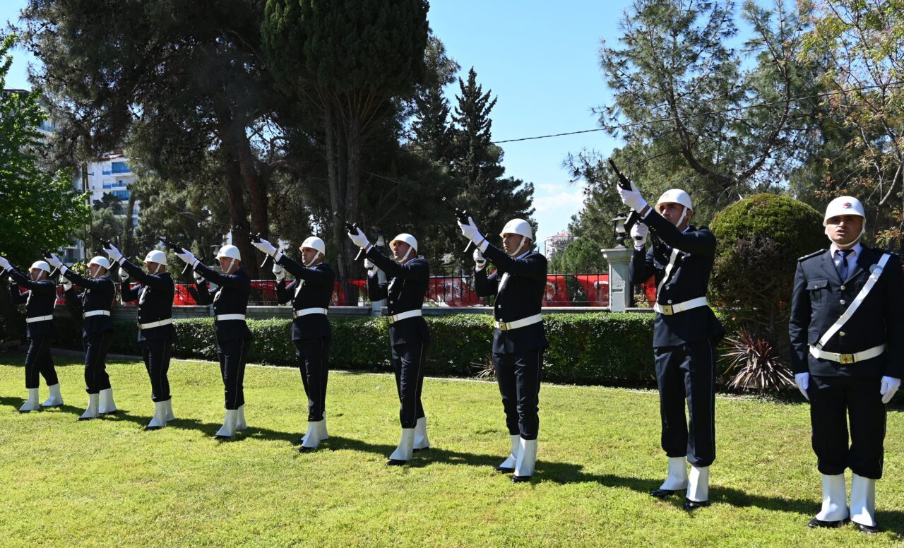 Antalya'da Cumhuriyet Meydanı'nda düzenlenen törende, İl Emniyet Müdürü Sabit Akın Zaimoğlu, Atatürk Anıtı'na çelenk sundu.