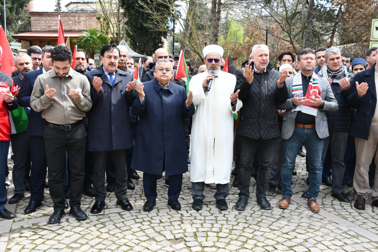 Filistin'e Destek Platformunun çağrısı üzerine cuma namazı sonrası Şeyh Edebali Külliyesi'ndeki Orhangazi Camisi önünde toplanan grup adına açıklama yapan Bilecik Şeyh Edebali Üniversitesi İlahiyat Fakültesi 4. sınıf öğrencisi Alper Kayabaşı, Gazze'de İsrail tarafından uzun zamandır soykırım uygulandığını söyledi.
