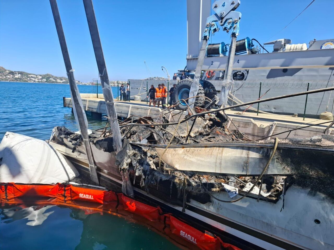 MUĞLA (AA) – Muğla'nın Bodrum ilçesinde yangında batan 7 motoryatın enkazı denizden çıkarılıyor.