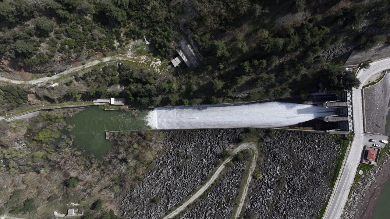 Tam kapasiteye ulaşan Doğancı Barajı'nın tahliye kapaklarının açıldığı görüldü.