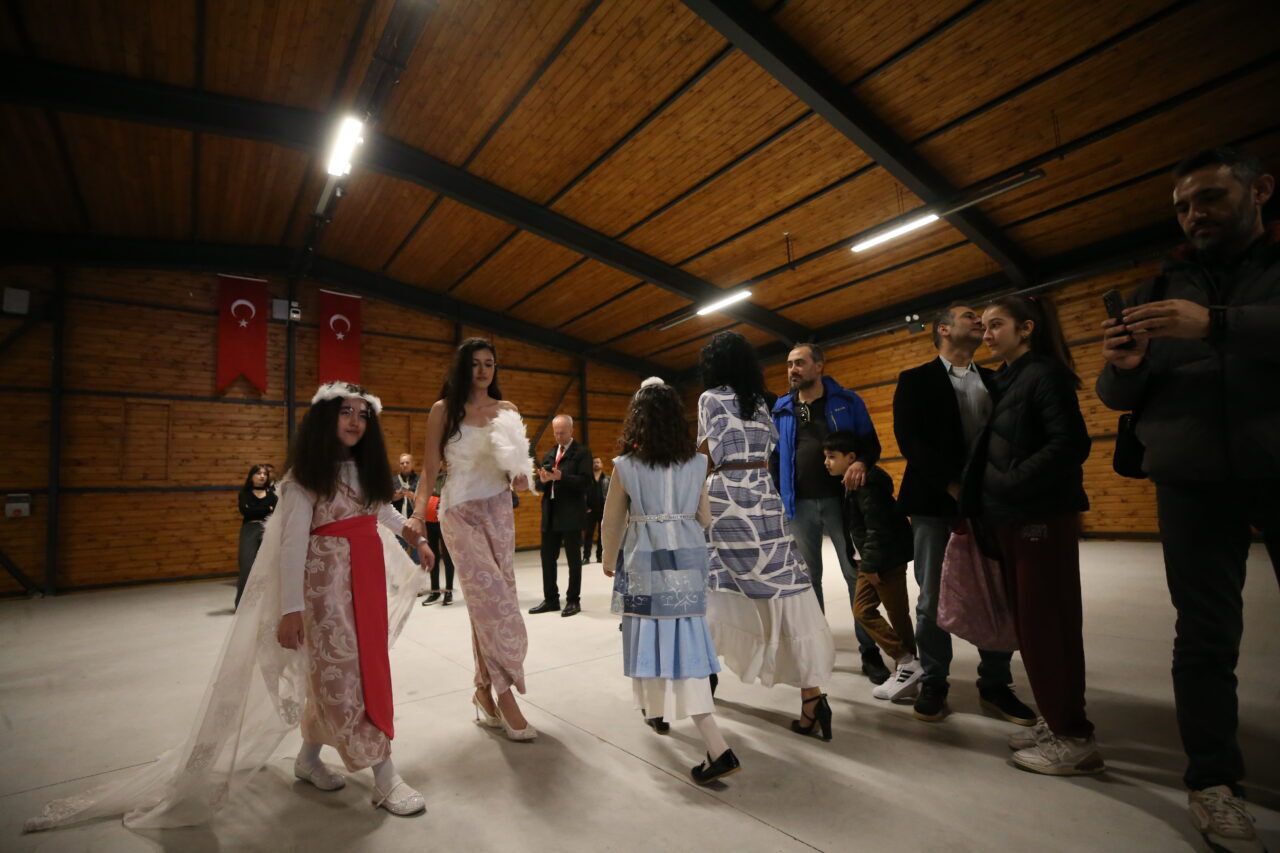 Hamidiye Tabyaları'ndaki hangarda düzenlenen defilede mankenler, çocuklarla Umay Ana figürlerinin de yer aldığı eserleri sergiledi.