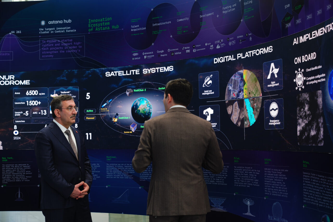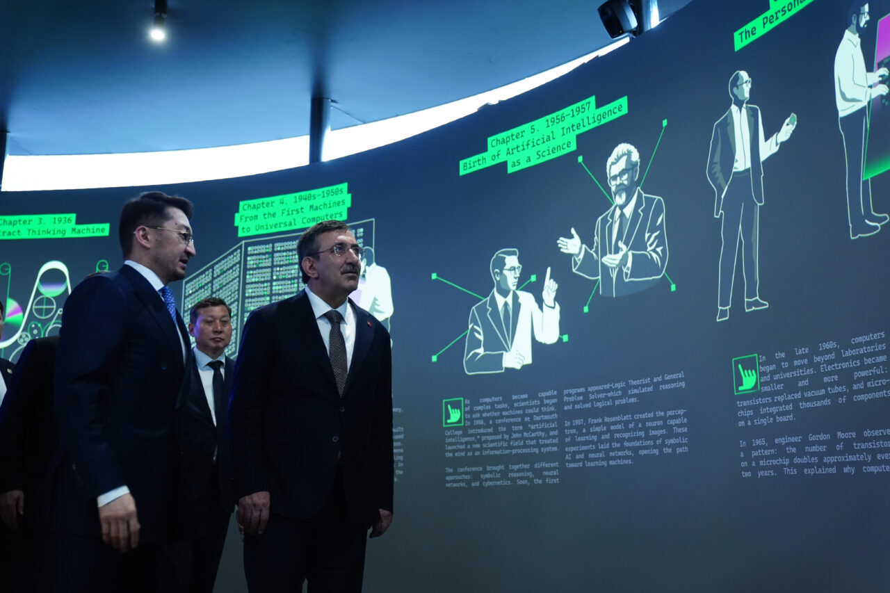 Daha sonra Bektenov ile Alem AI Yapay Zeka Uluslararası Merkezi'ne geçen Yılmaz'a buradaki yapay zeka çalışmalarına ilişkin brifing verildi.