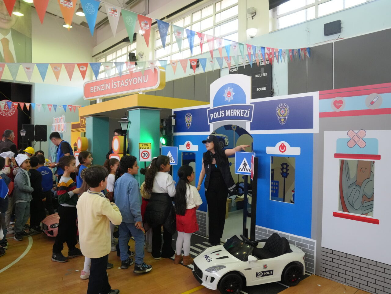Postane, itfaiye, pastane, kitabevi, akvaryum, tamirci, benzin istasyonu, karakol ve hastane gibi alanları ziyaret eden çocuklara, oyunlar eşliğinde meslekler tanıtıldı.