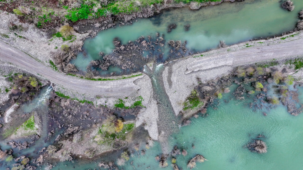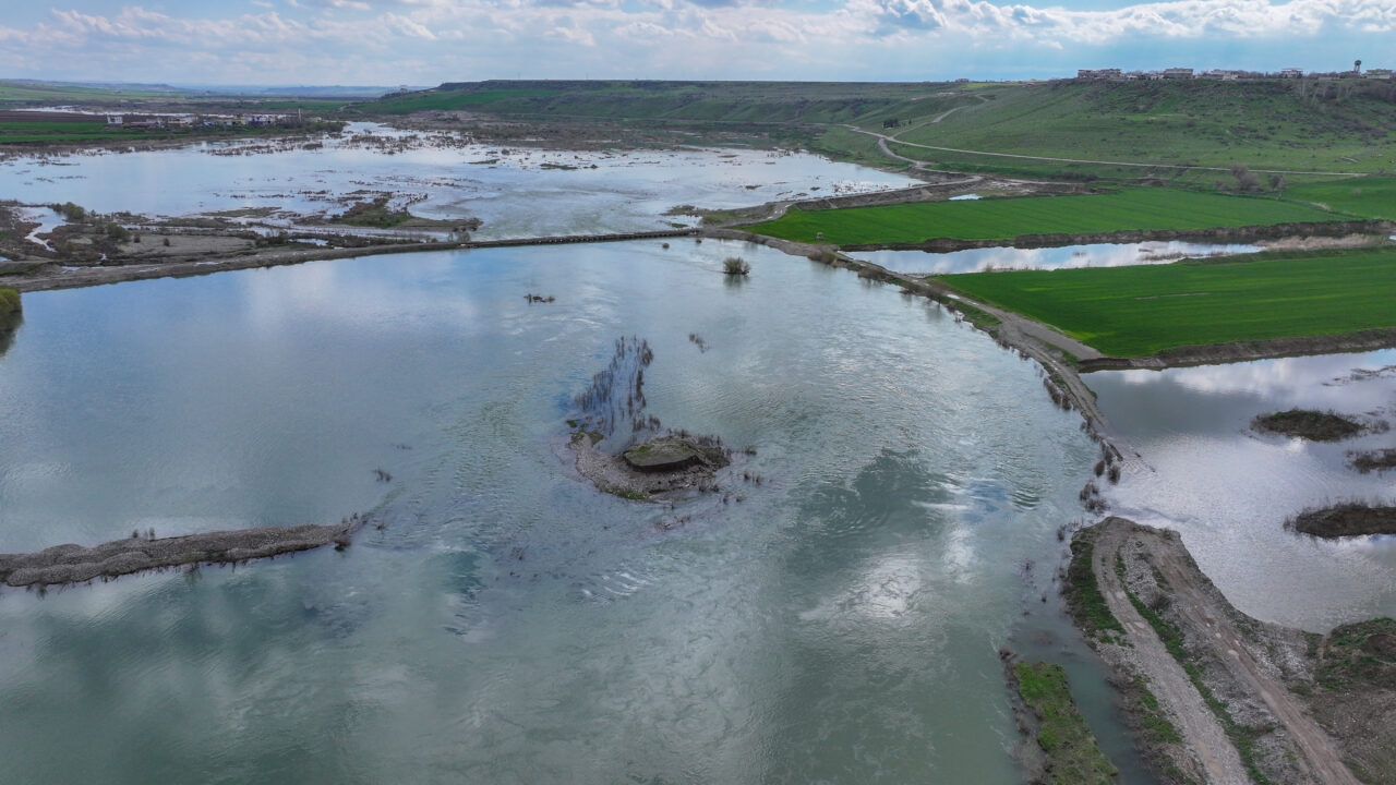 Dronla kaydedilen görüntülerde, debisi artan Dicle Nehri, su altında kalan tarım arazileri ve yol yer alıyor.