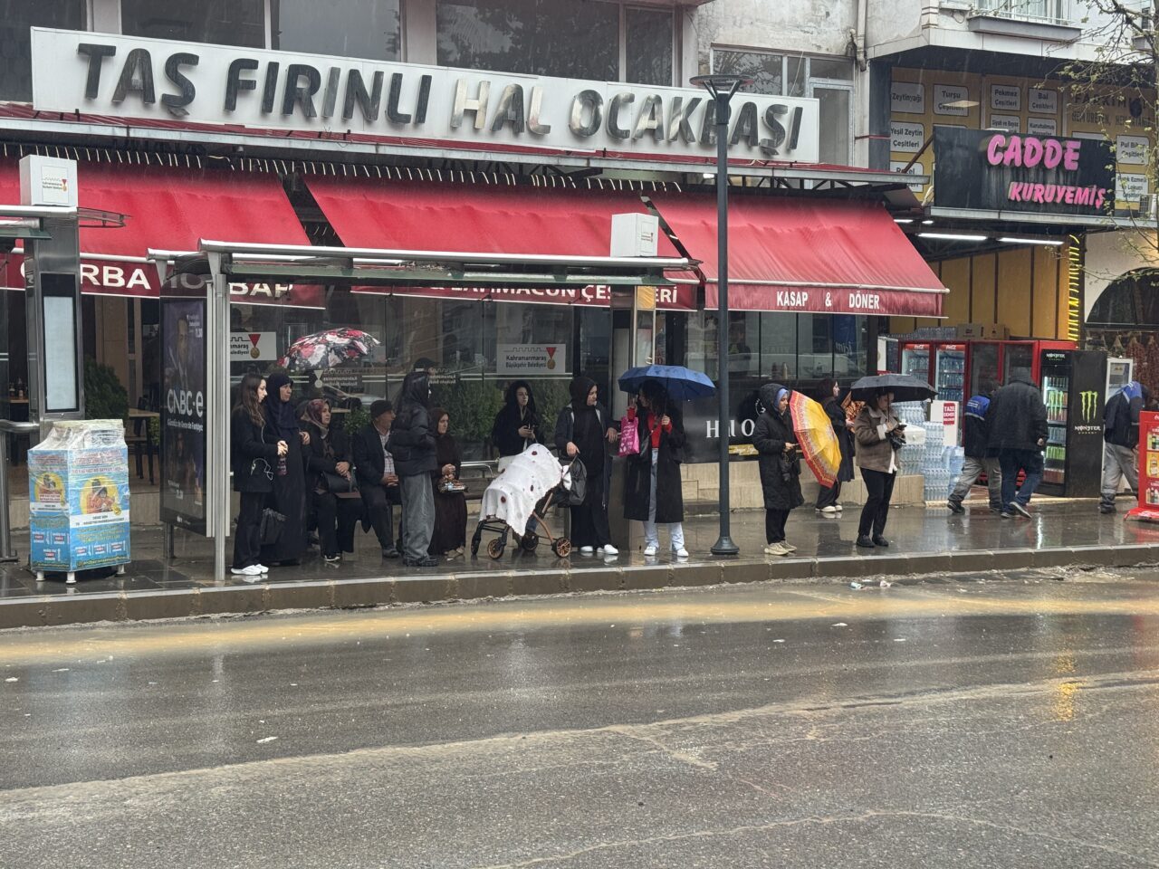 Yağışa hazırlıksız yakalanan bazı vatandaşlar, otobüs duraklarına sığınarak yağmurdan korundu.