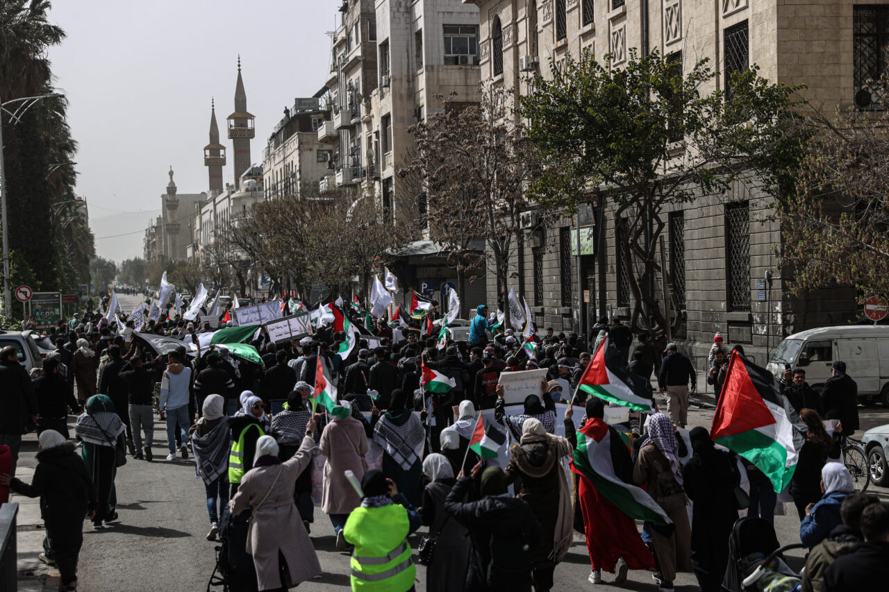 Suriye'nin tarihi öneme sahip Emevi Camisi'nde kılınan cuma namazının ardından başlayan gösteride, katılımcılar İsrail ve İsrail Başbakanı Binyamin Netanyahu karşıtı sloganlar attı.
