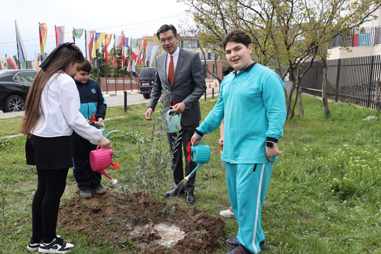 Etkinliğin sonunda, Türkiye'nin Tiflis Büyükelçisi Arı, öğrencilerle birlikte okul kampüsünün önünde zeytin fidanı dikti.