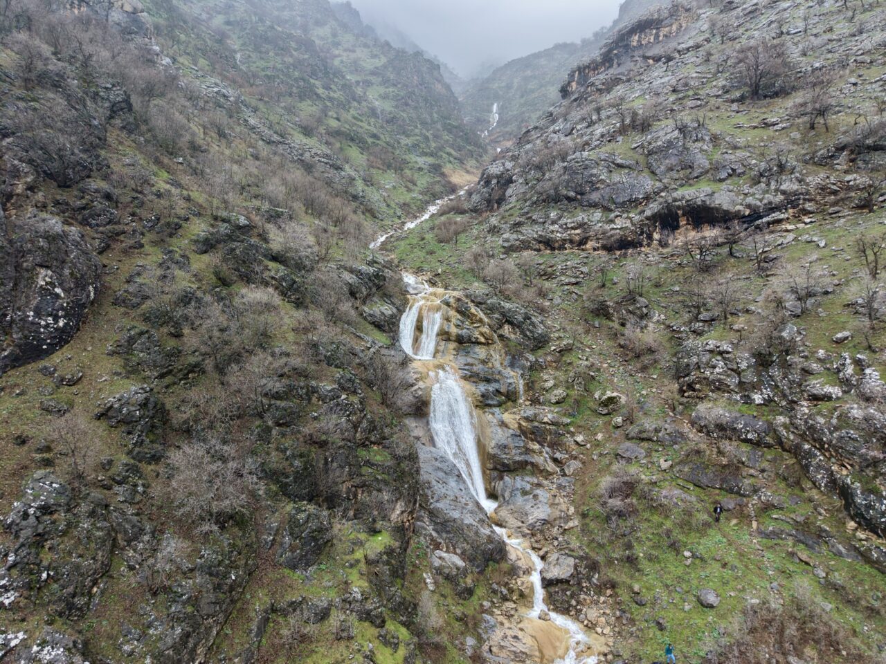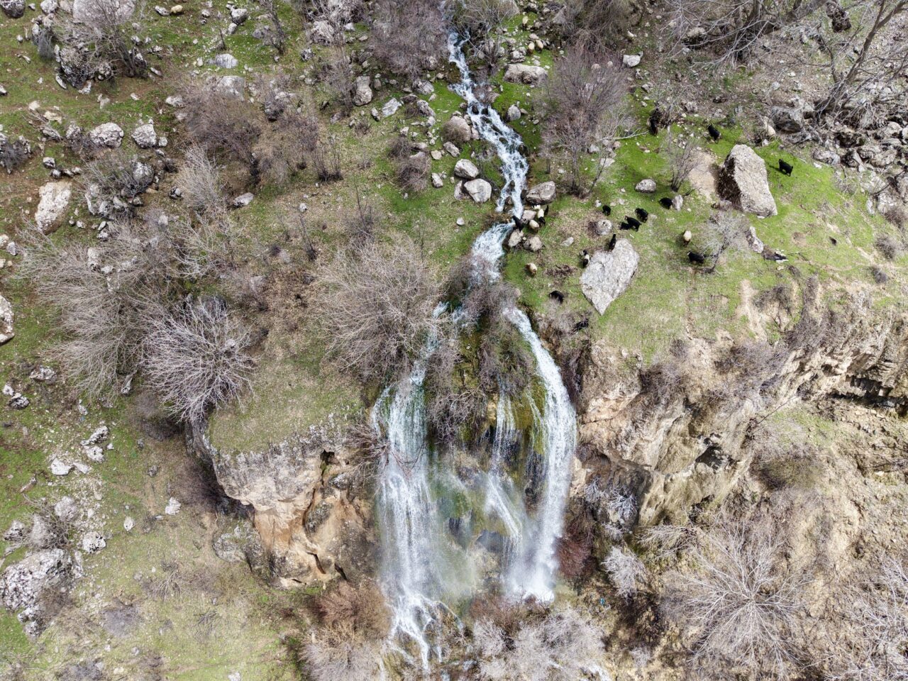 Canlanan doğayla bütünleşen, karların erimesi ve yağışlarla daha coşkulu akan şelalelerin manzarası dronla kaydedildi.