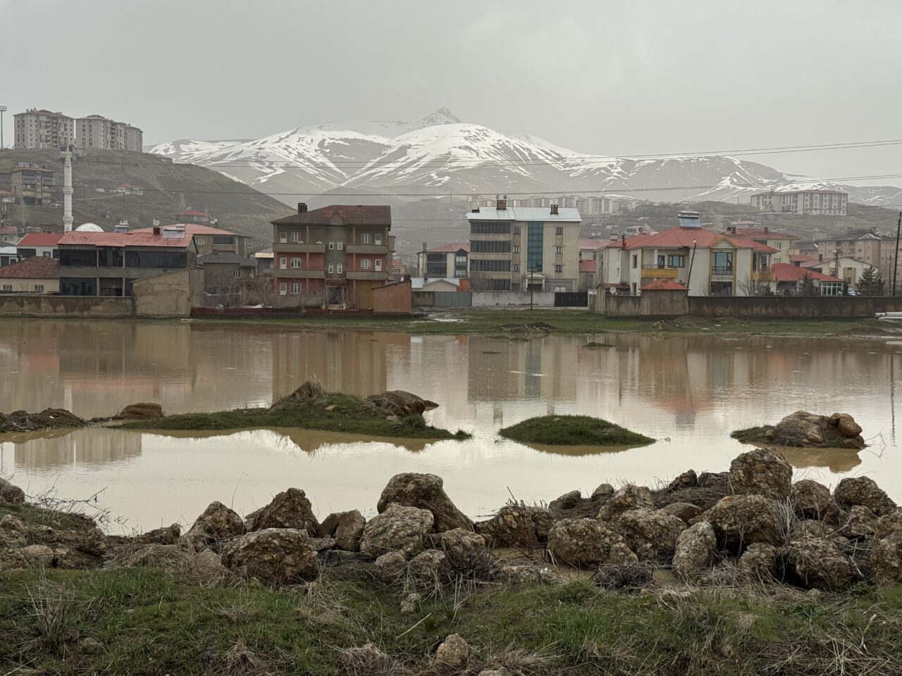 Mahalleden geçen su kanalının seviyesinin yükselmesi üzerine ekipler bölgede çalışma başlattı. İş makineleriyle kanal çevresine toprak çekilerek suyun yola taşması engellendi.