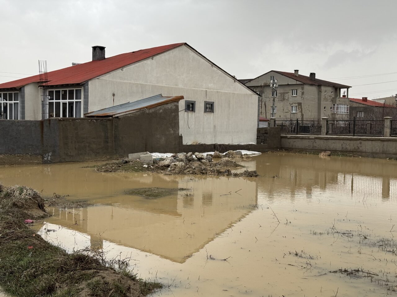 Yeni Mahalle'de bulunan Sabancı İlk ve Ortaokulu'nun bahçesi de yağış sonrası suyla kaplandı.