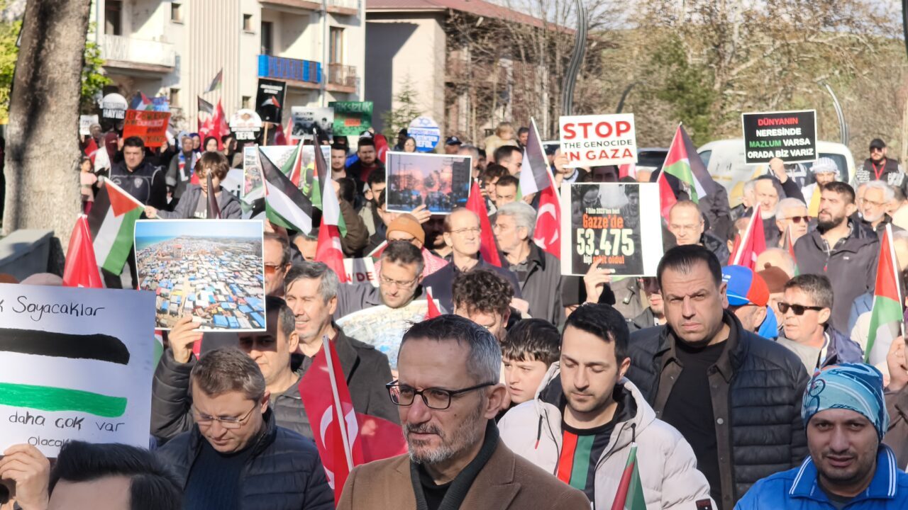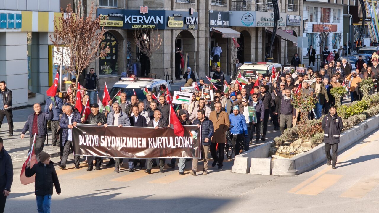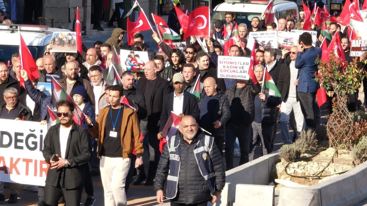 Türk ve Filistin bayrakları ile dövizler taşıyan grup, İsrail aleyhine sloganlar atarak Kemal Güneş Caddesi'ne kadar yürüdü.