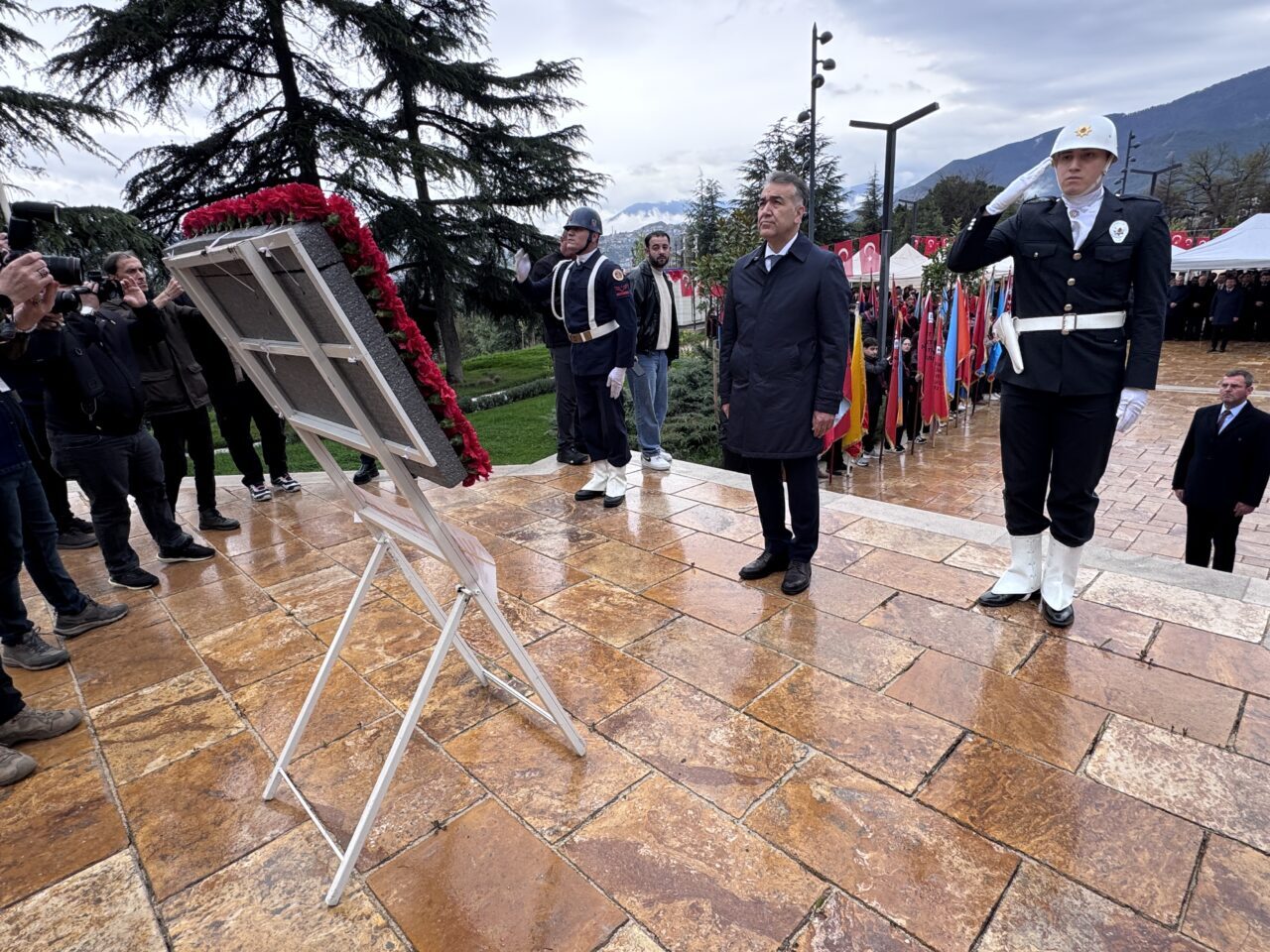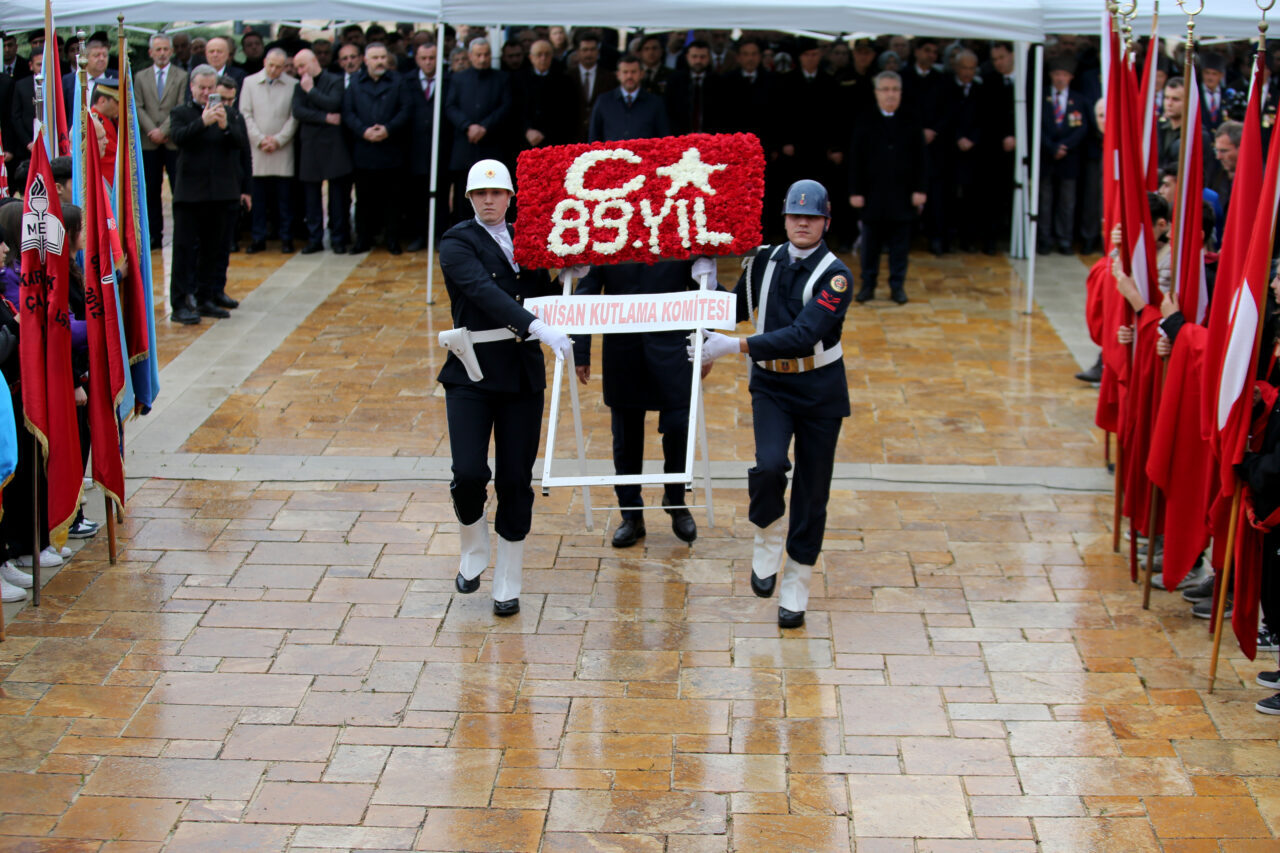 Yenişehir Atatürk Anıtı'nda saygı duruşunda bulunulması ve İstiklal Marşı'nın okunmasıyla başlayan törende, Vali Oktay Çağatay, anıta çelenk sundu.