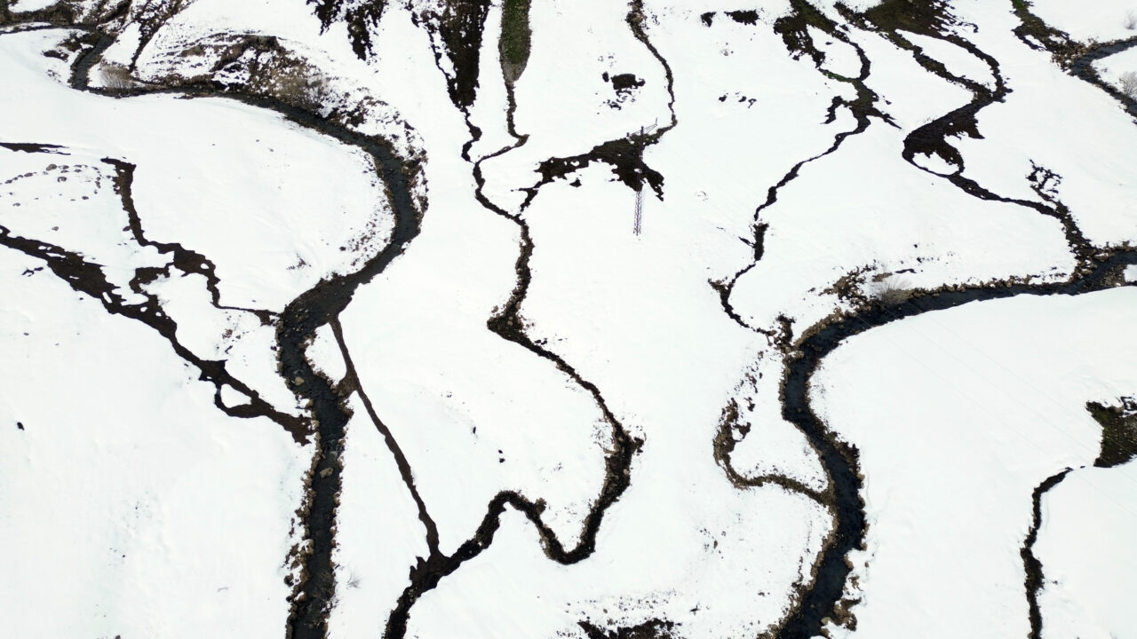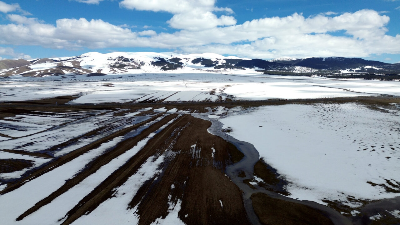 Sarıçam ormanları arasında karların erimesiyle ortaya çıkan dereler, kar sularıyla kaplanan tarım alanları dronla görüntülendi.
