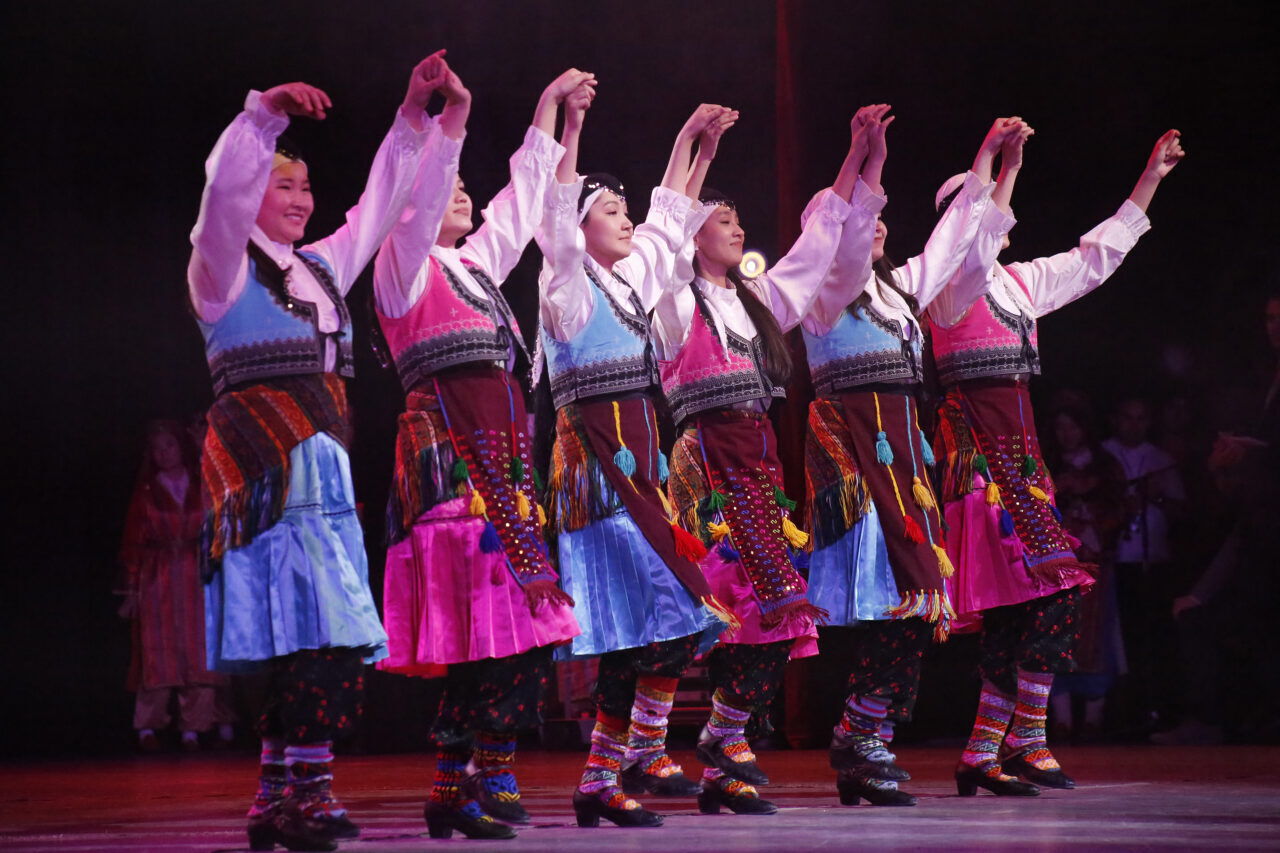 Kırgız ve Türk halk dansların sergilendiği sahnede eski kursiyerler, Türkçe şarkılar seslendirdi.