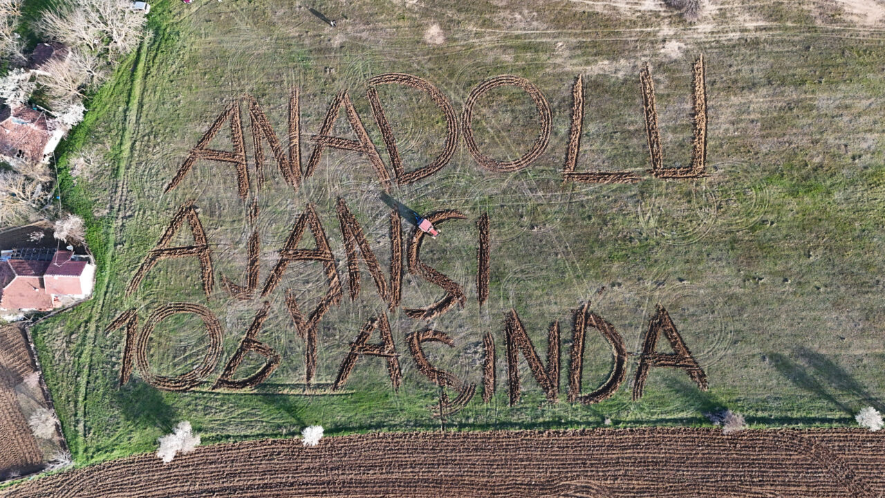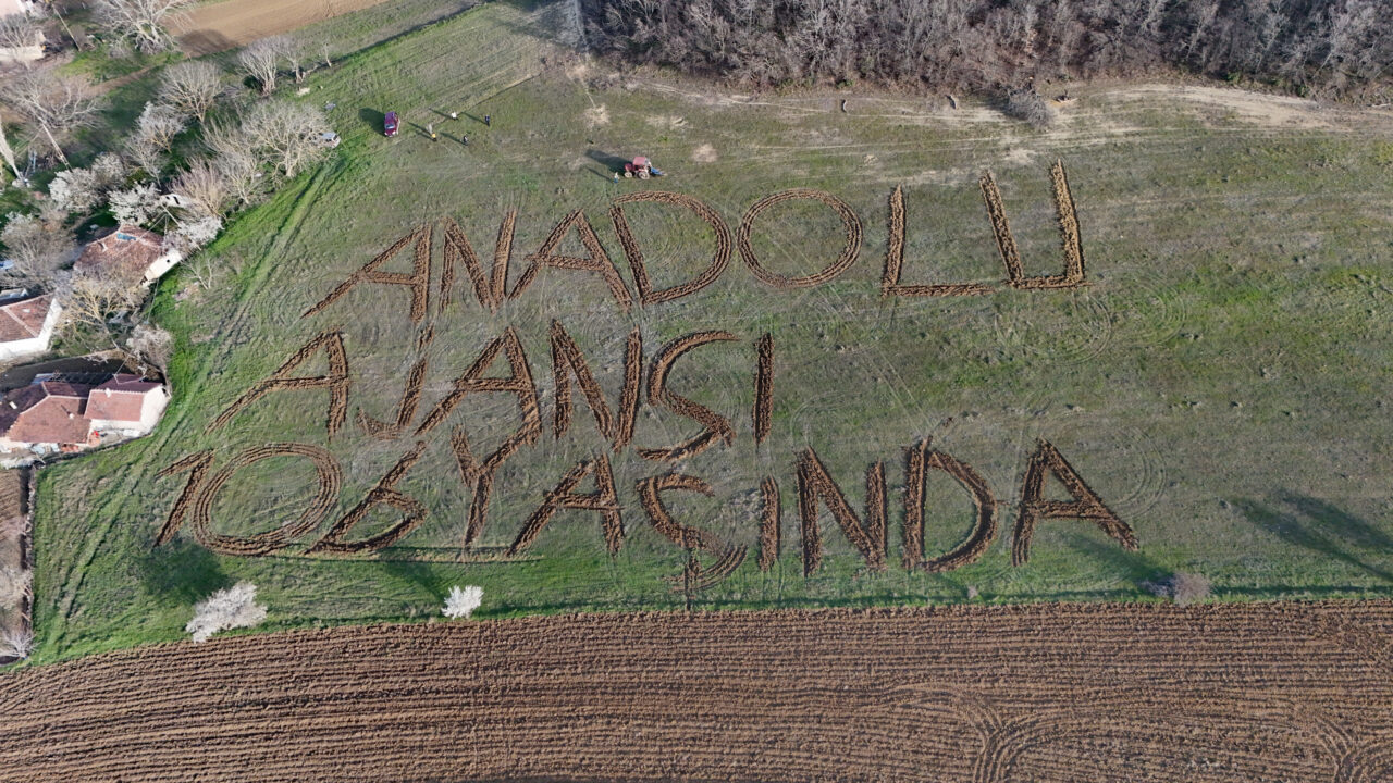 Çavuşköy'de araziyi tuval gibi kullanan Tunçkol, traktör pulluğu ile "Anadolu Ajansı 106 Yaşında" yazdı.