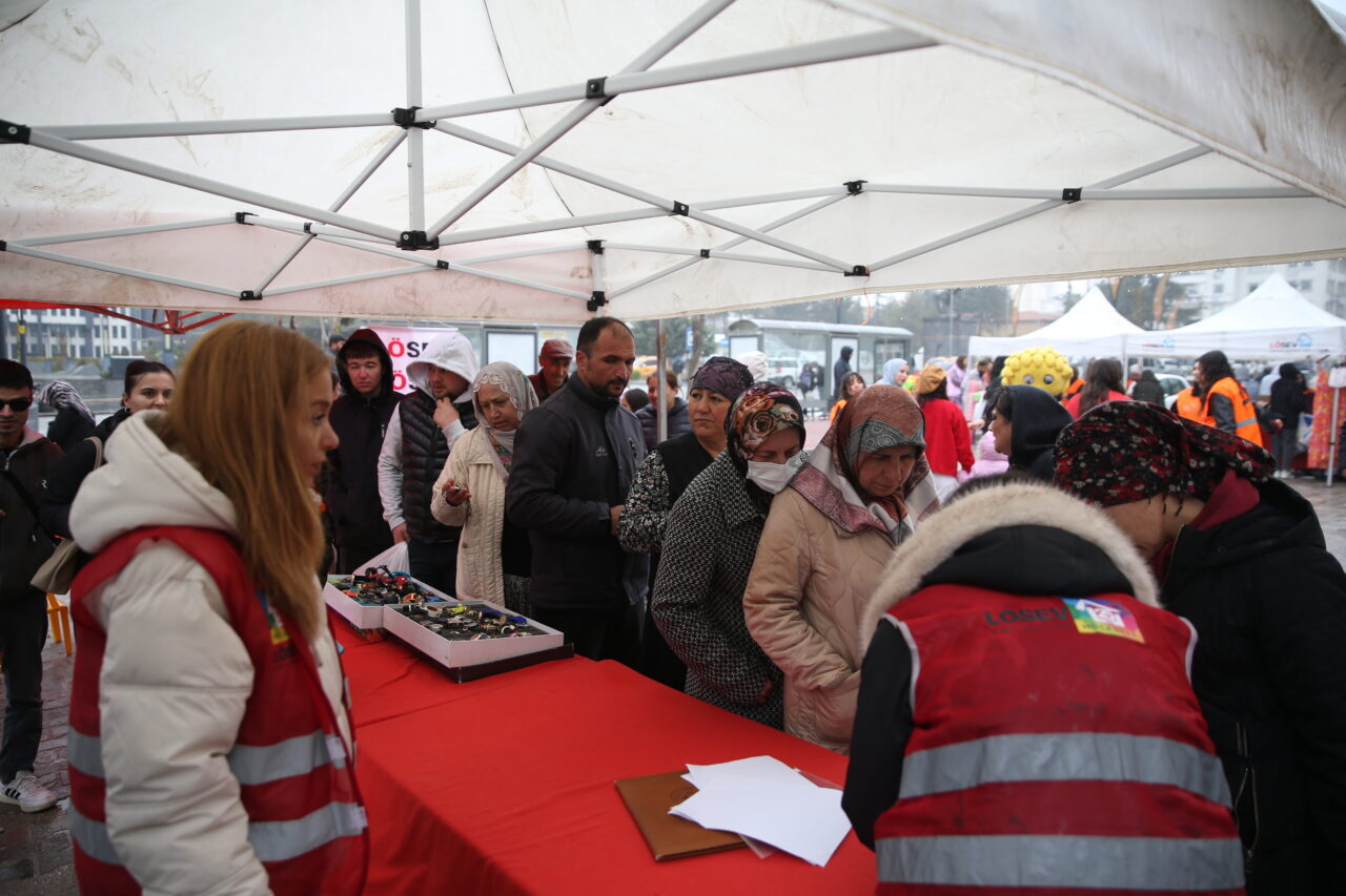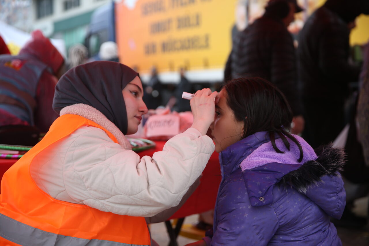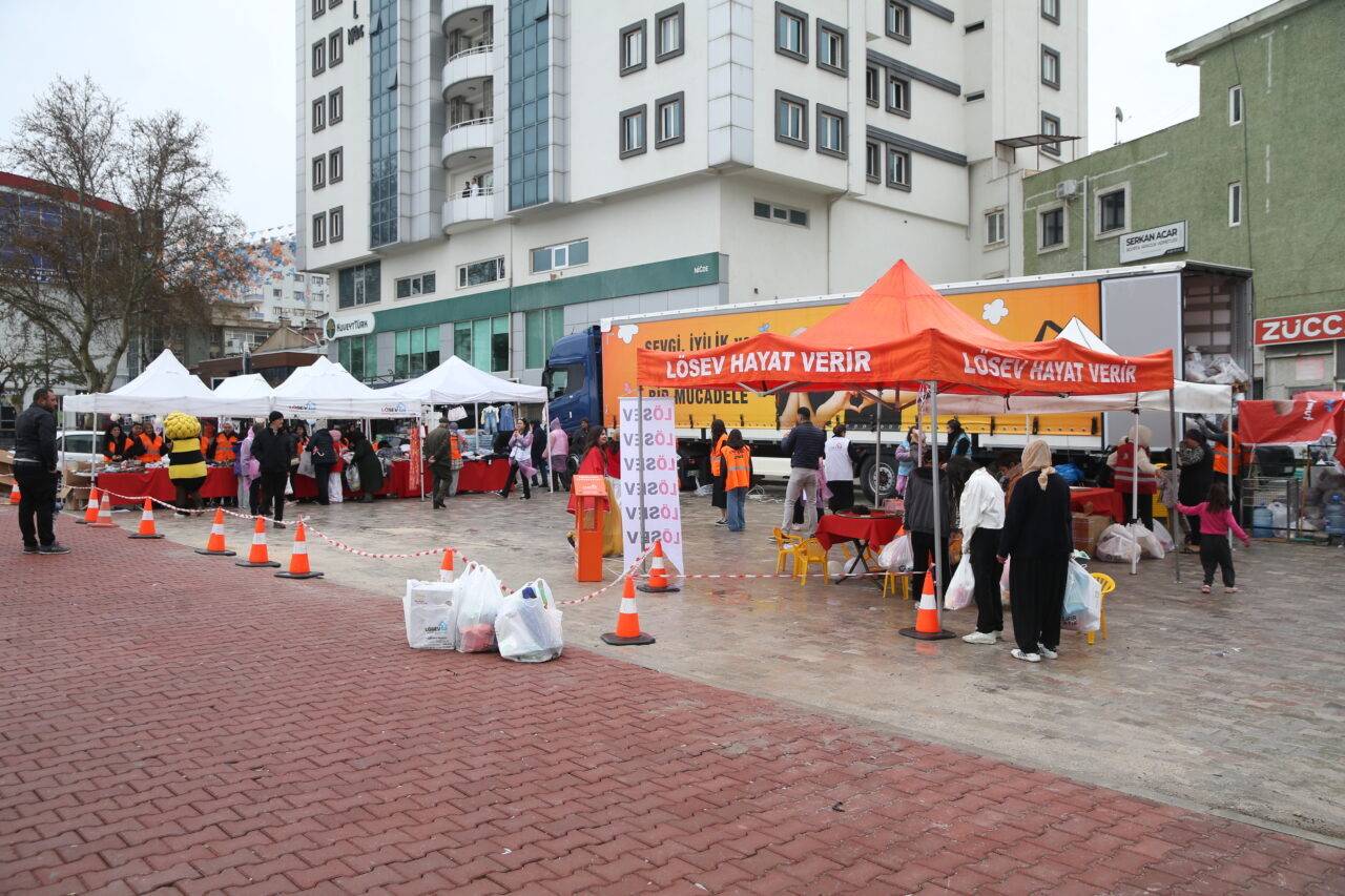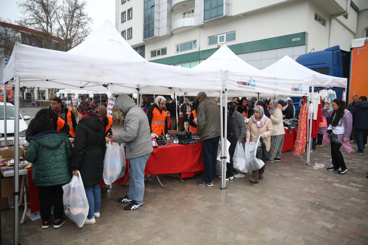 Cumhuriyet Meydanı'nda konuşlanan tırdaki giyim, kırtasiye ve temizlik malzemeleri ile gıda ürünleri, ekipler tarafından ailelere takdim edildi.