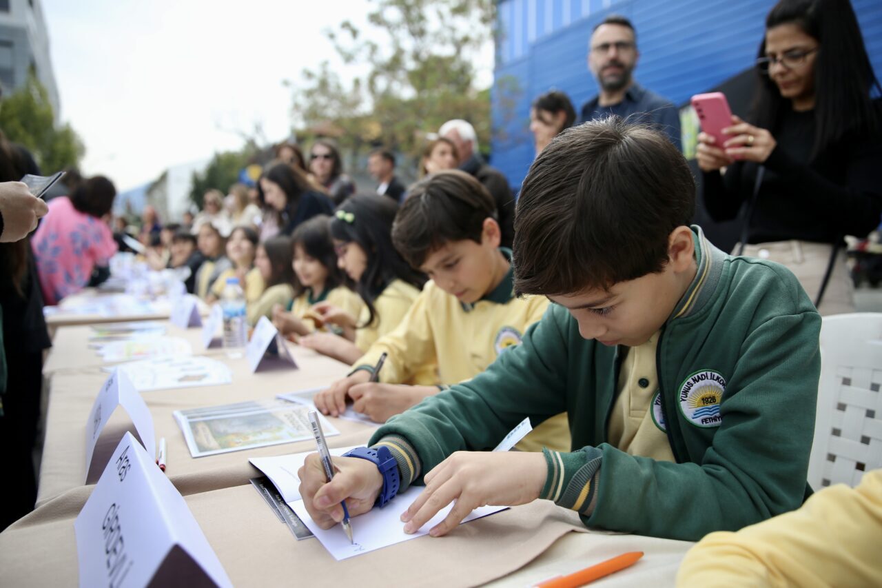 Yunus Nadi İlkokulu'nda yürütülen projede, öğrenciler, öğretmenleri ile yazarlar Şahsene Camız ve İclal Nur'un desteğiyle hazırladıkları eserlerini, Fethiye Belediyesi Özer Olgun Kültür Merkezi önünde düzenlenen programda imzaladı.