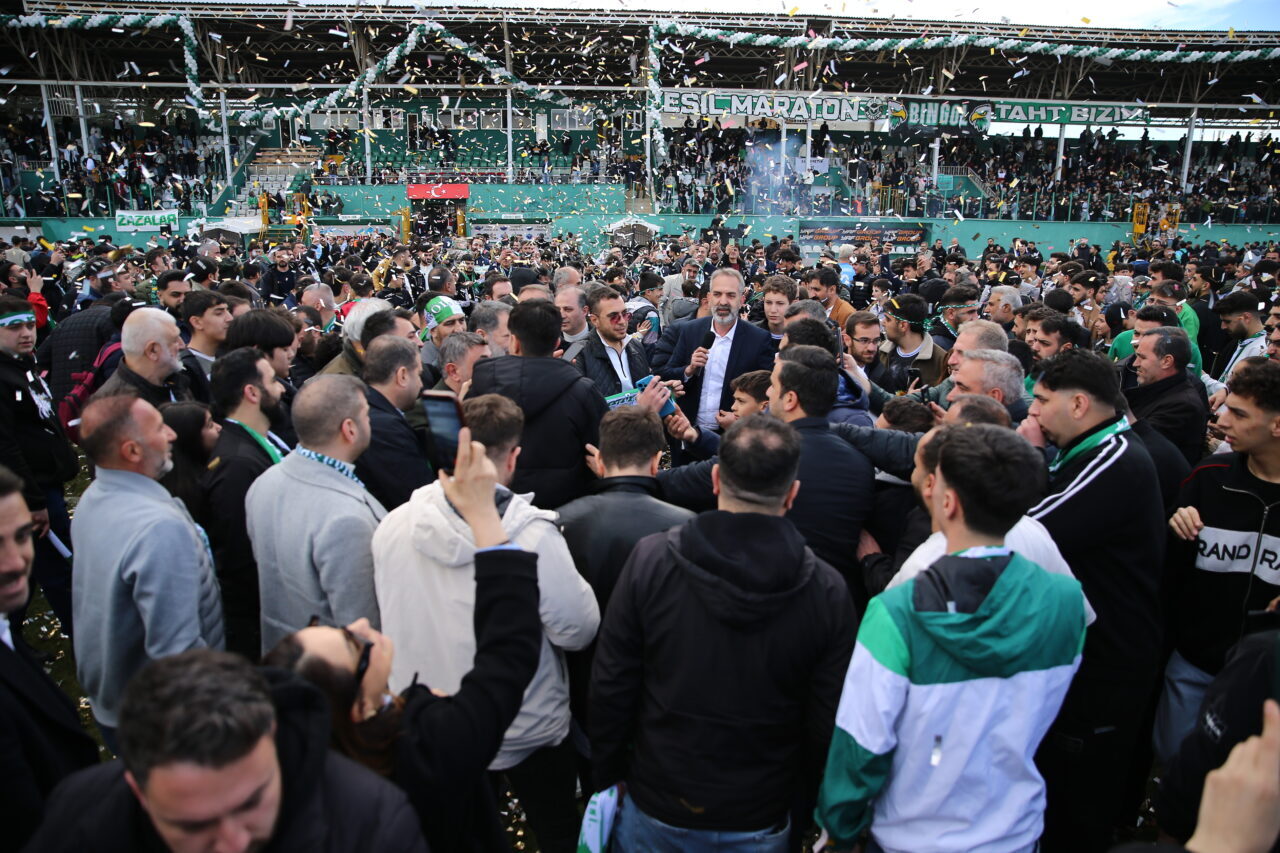 Vali Cahit Çelik, Belediye Başkanı Erdal Arıkan, 12 Bingölspor Başkanı Mehmet Engin Özturan ve futbolcular, sahada taraftarlarla şampiyonluk sevincini yaşadı.