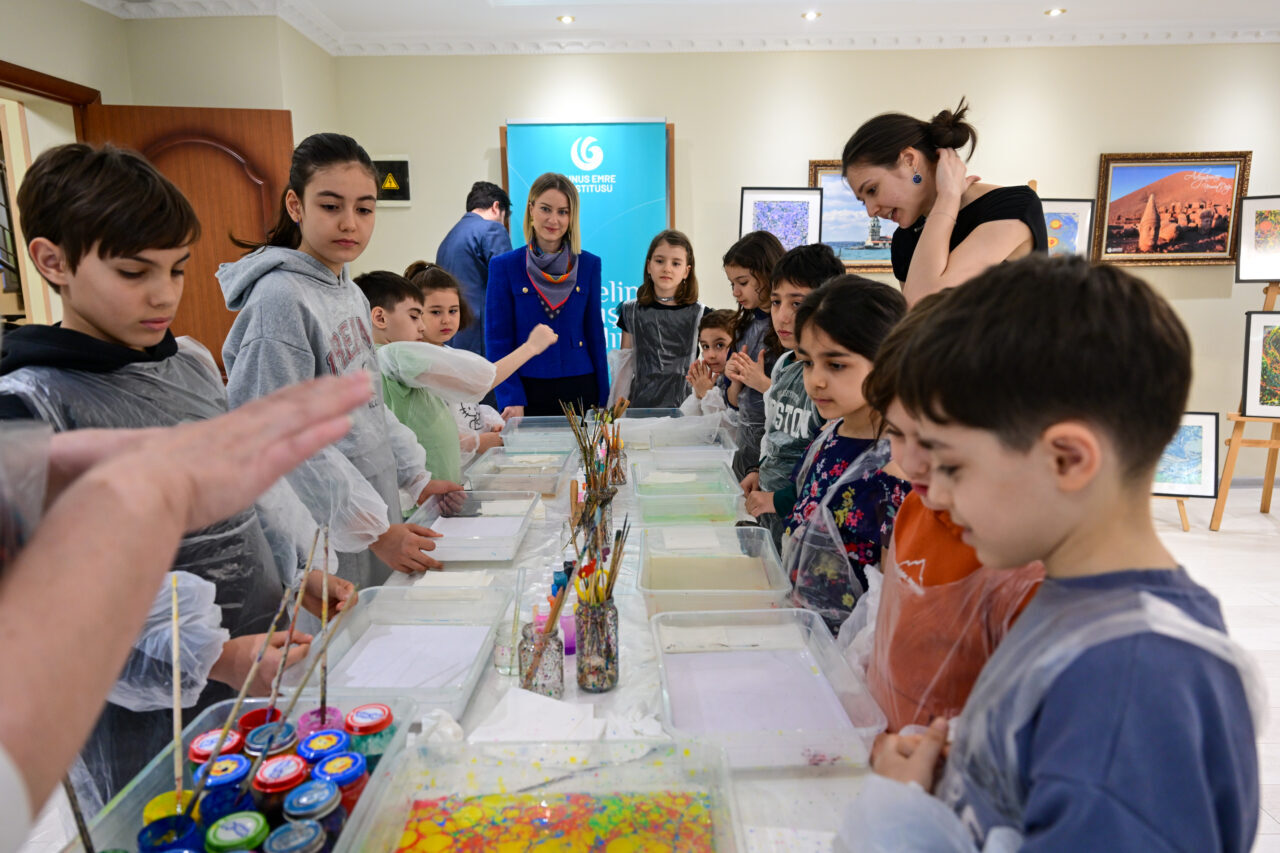 Linol baskı atölyesindeki çalışmalara katılan çocuklar, beyaz tişörtler üzerine 23 Nisan'a ilişkin sembol ve yazılarla baskı çalışması yaptı. Bazı çocuklar da düzenlenen ebru atölyesinde ilk defa ebru sanatıyla tanıştı.