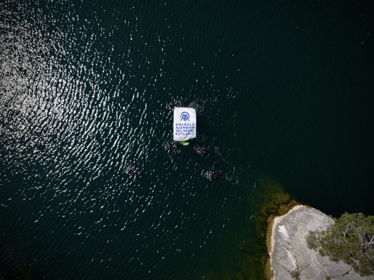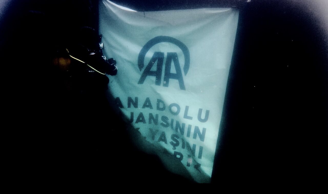 Su sıcaklığının 6 derece olduğu bölgede 17 metre derine inen dalgıçlar, burada 3 metre uzunluğundaki "Anadolu Ajansının 106. yılını kutlarız" pankartını açtı.