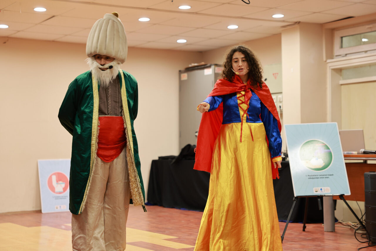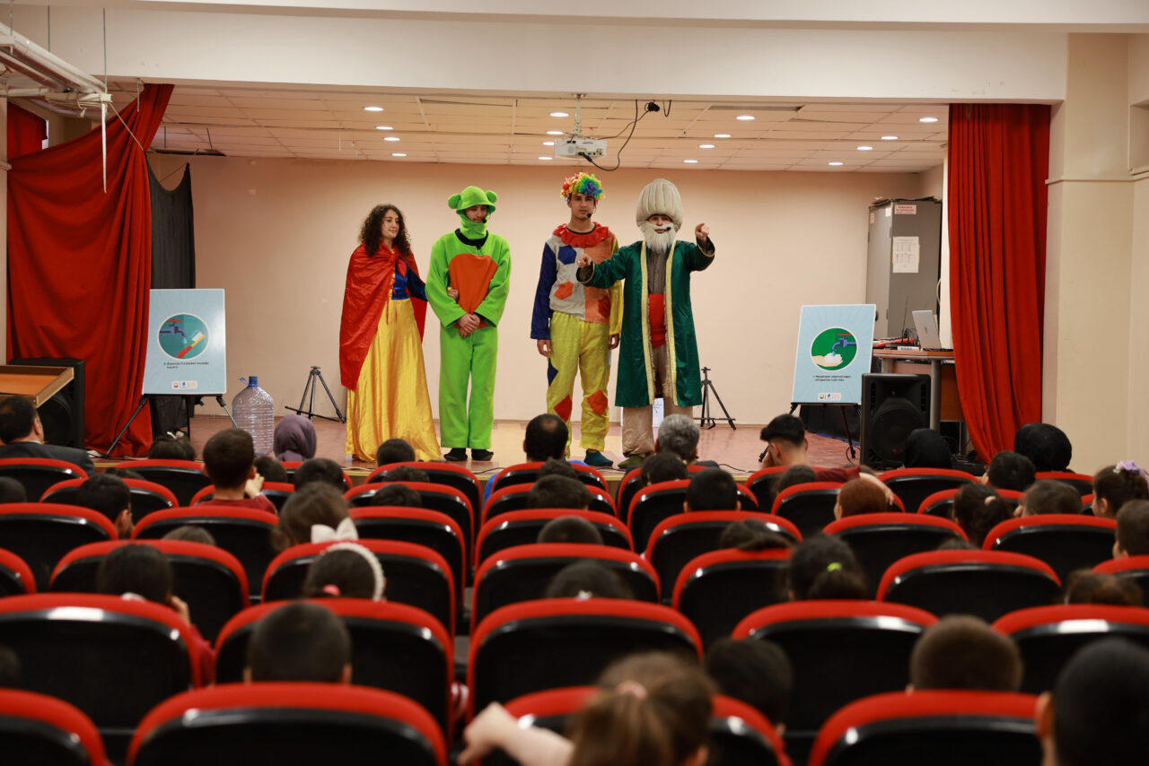 Öğrenciler, Göbeklitepe Kültür ve Sanat Tiyatro ekibince gerçekleştirilen gösterilerle suyun değerini, iklim değişikliğinin etkilerini ve tasarrufun önemini öğreniyor.