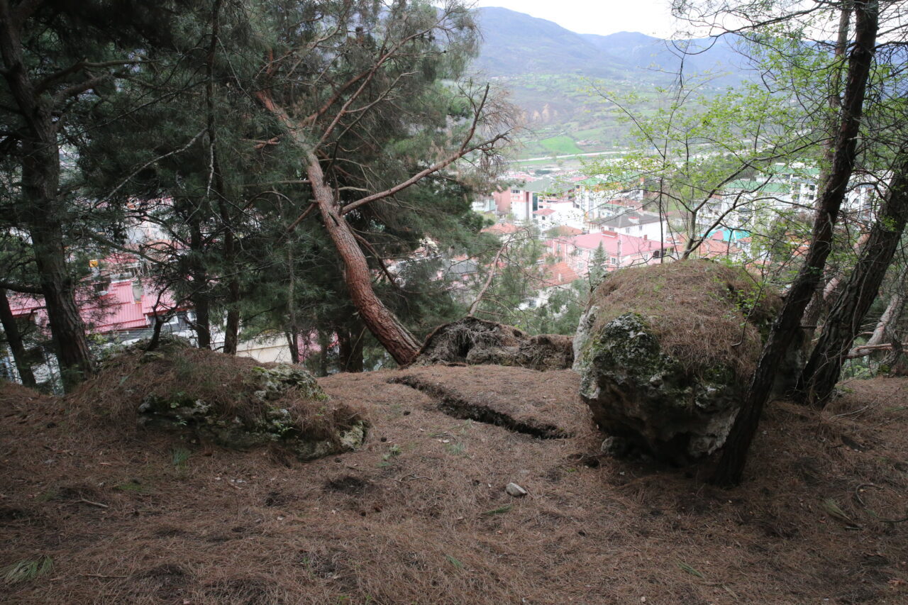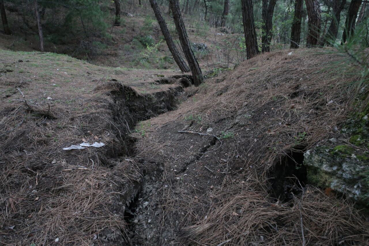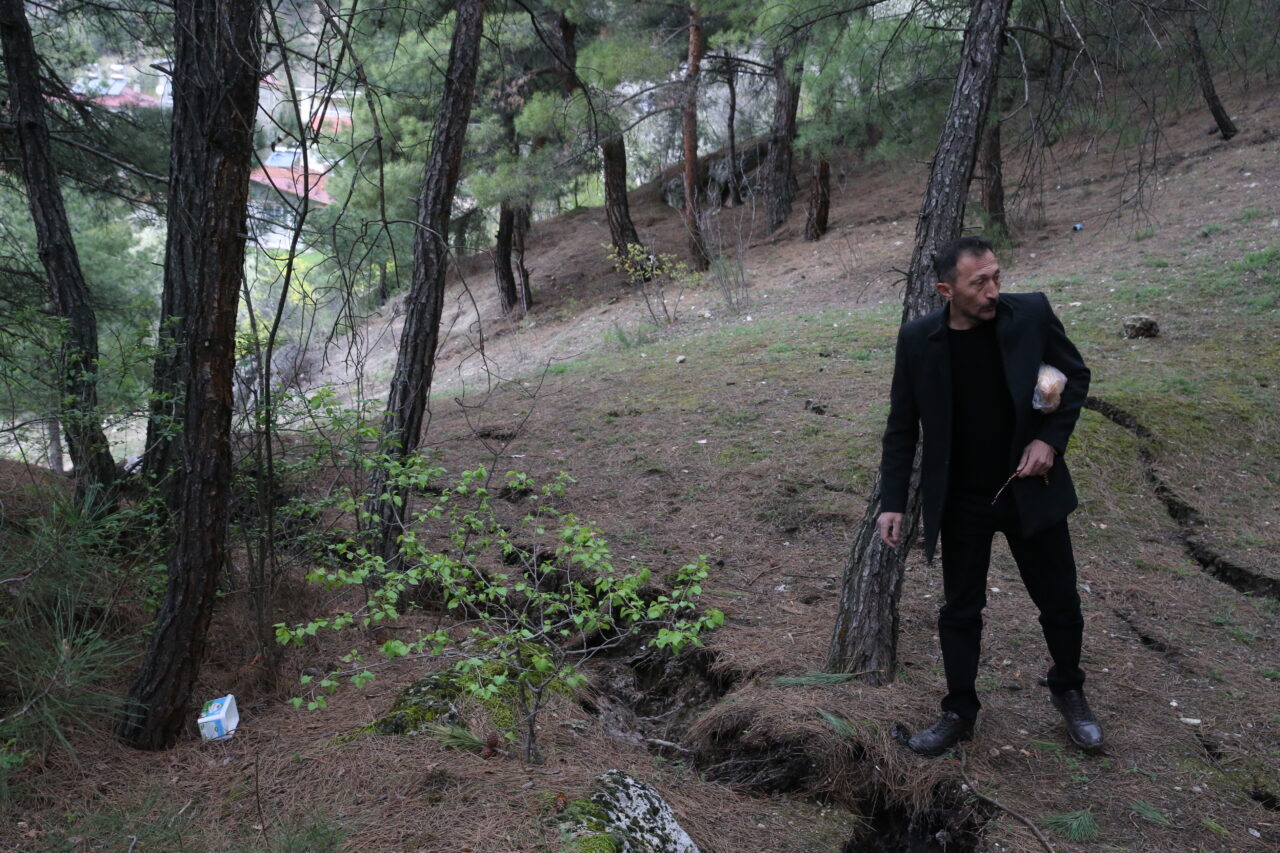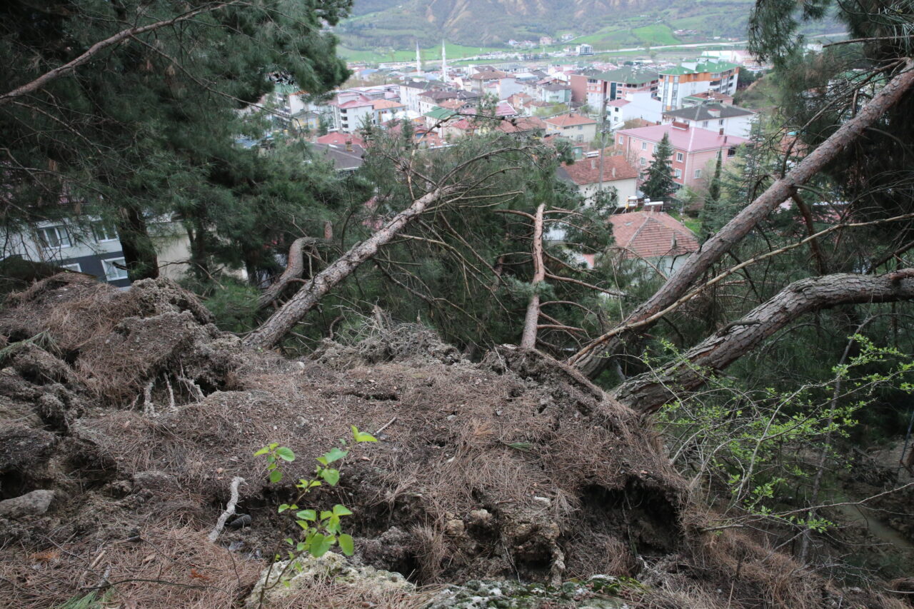 Heyelan bölgesinde çok sayıda çam ağacının devrildiği, arazide çatlakların oluştuğu görüldü. Güvenlik önlemi alınan bölge, araç trafiğine kapatıldı.