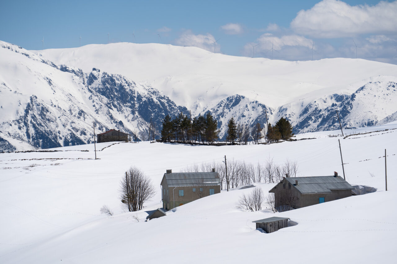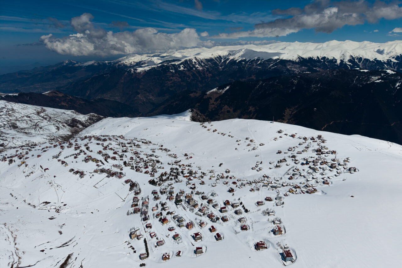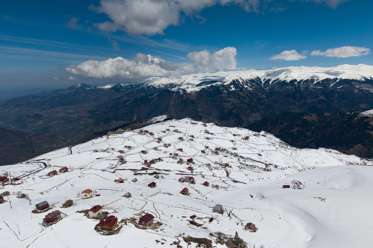 Karla kaplı yayla evleri ve yaylanın zirveleri dronla kaydedildi.
