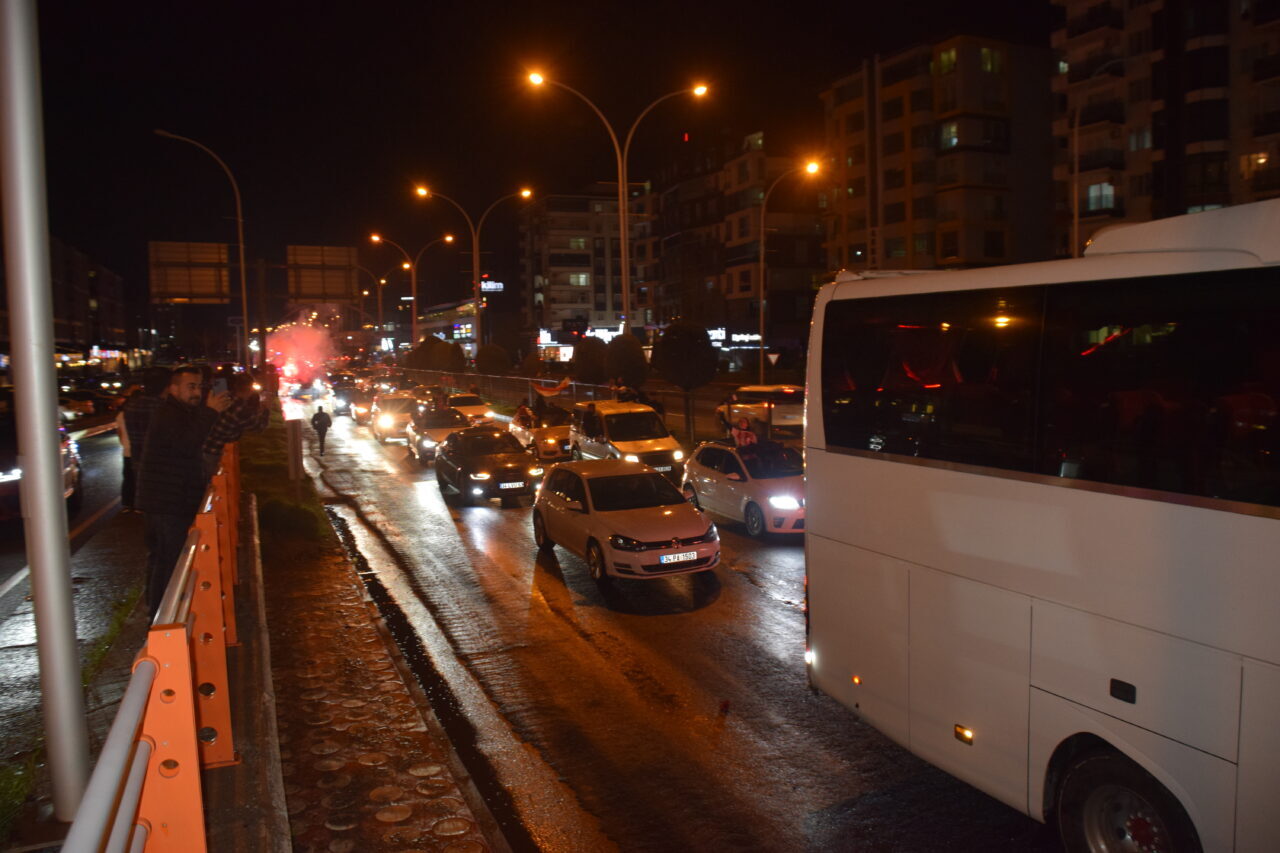 Havalimanı kavşağından Turgut Özal Bulvarı’na kadar araç konvoyu eşliğinde ilerleyen takım otobüsündeki futbolcular, taraftarları selamladı.