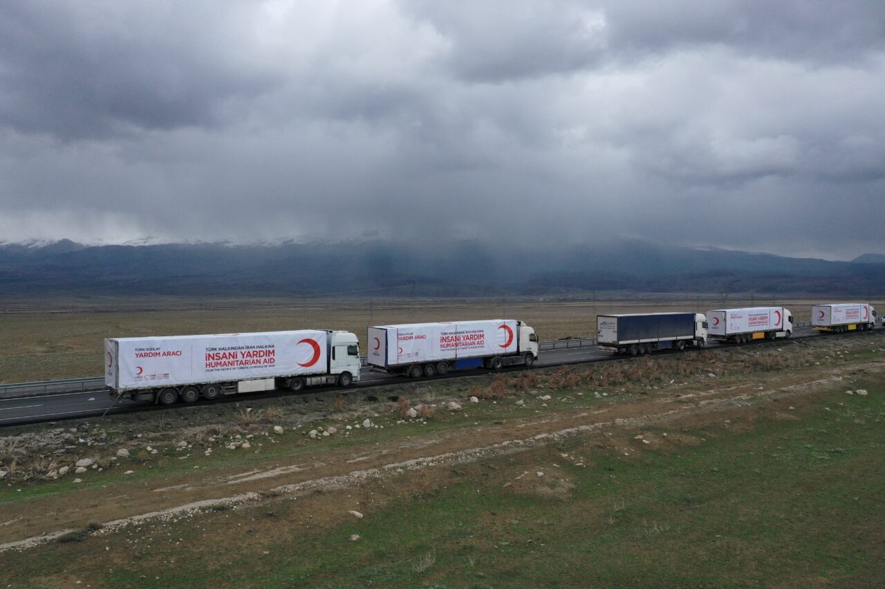 Önlerinde "Türk halkından kardeş İran halkına insani yardım" yazılı pankartlar asılan 4 tır ile Uluslararası Kızılhaç ve Kızılay Dernekleri Federasyonuna ait bir tır, Gürbulak Gümrük Kapısı'ndan İran'a geçti.