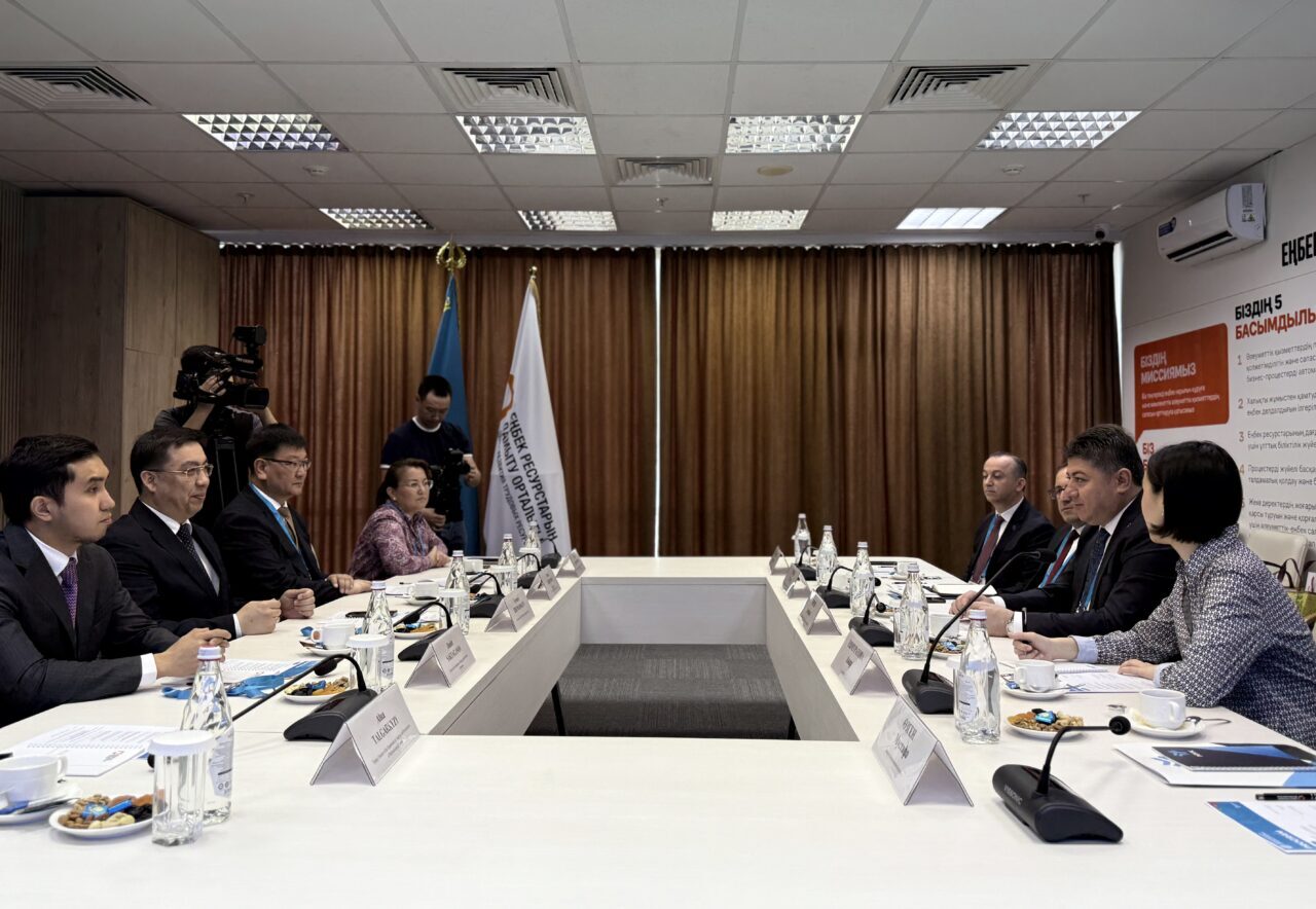 Çalışma ziyareti kapsamında Kazakistan'ın başkenti Astana'da bulunan Mesleki Yeterlilik Kurumu (MYK) Başkanı Aşkın Tören, Kazakistan Çalışma ve Nüfusun Sosyal Korunması Bakanlığına bağlı İşgücü Geliştirme Merkezi Başkanı Yerasıl Jumanbayev ile bir araya geldi.