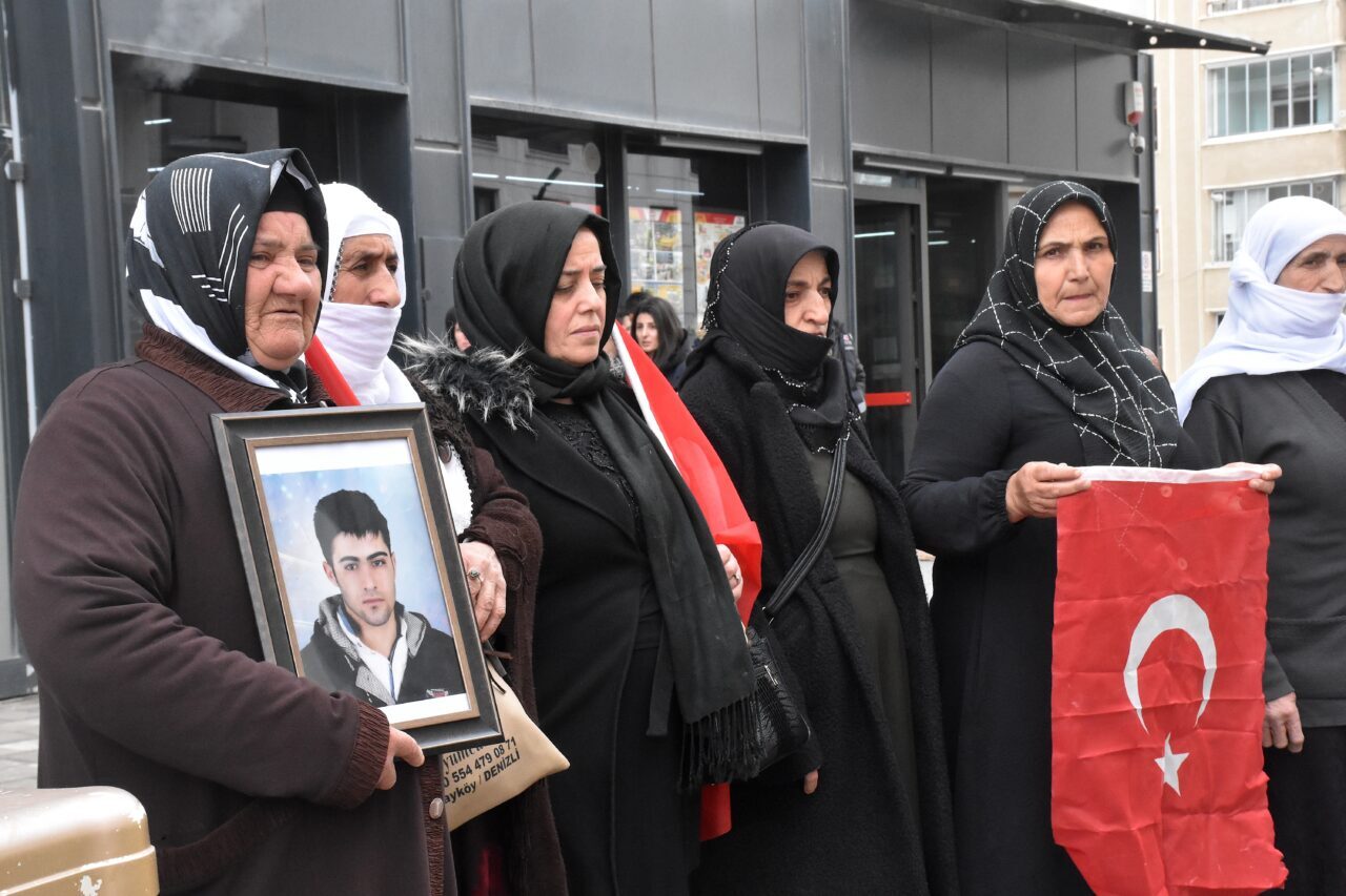 Menekşe Sokak'ta bir araya gelen aileler, Türk bayrakları ve evlatlarının fotoğraflarını taşıyarak, DEM Parti İl Başkanlığı binasının önüne yürüdü.