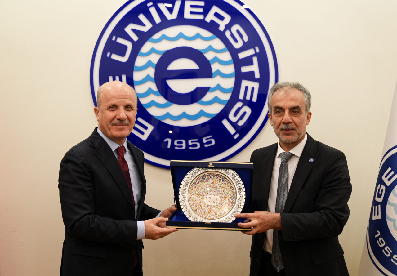 İzmir programı kapsamında ziyaretlerine İzmir Katip Çelebi Üniversitesinden başlayan Özvar, Rektör Prof. Dr. Saffet Köse'den üniversitenin faaliyetlerine ilişkin bilgi aldı.